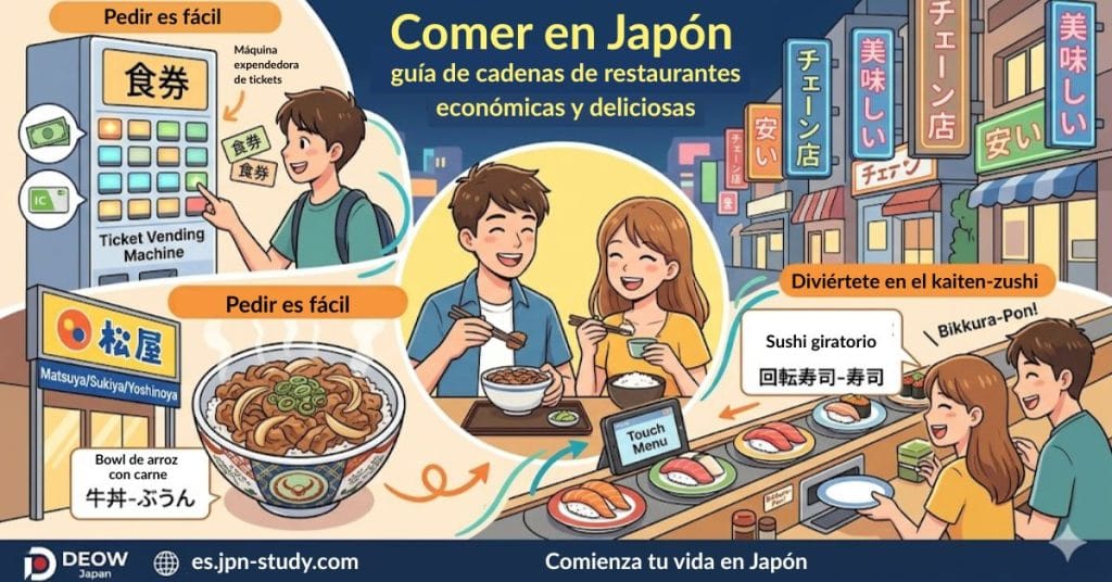Aunque Japón es famoso por el sushi de alta gama y la carne wagyu, la verdadera “comida del día a día” para los japoneses y estudiantes se encuentra en los restaurantes de cadena (チェーン店 – chēn-ten).